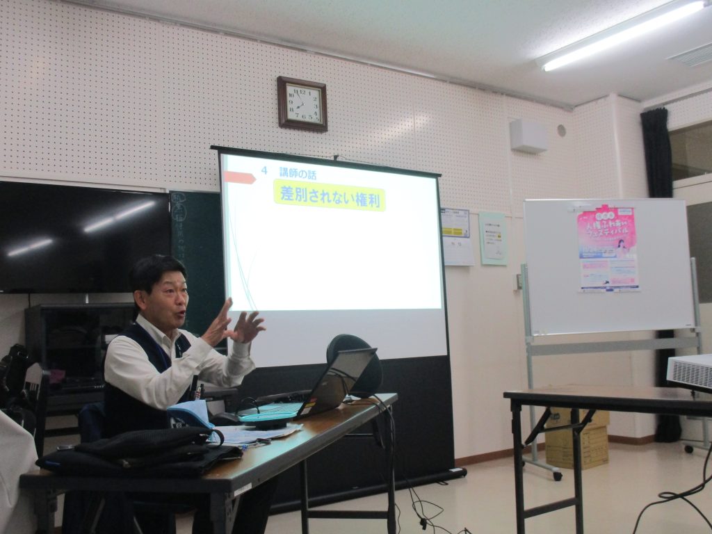 11月10日(月)、市役所人権政策室の職員が来館し、人権学習地区巡回講座「ふれあい・ほっとミーティングin境」を開催しました。「ネット社会における人権」をテーマに、SNS上での人権問題を題材にしたDVDの視聴を通して、思いやりのある情報発信のあり方について考えました。