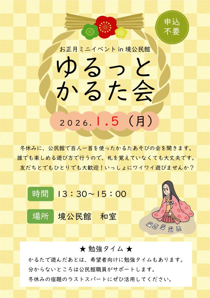 「ゆるっとかるた会」については、中学生の参加もあわせて募集しています。日本の伝統文化に親しみながら、楽しいひとときを過ごしましょう。