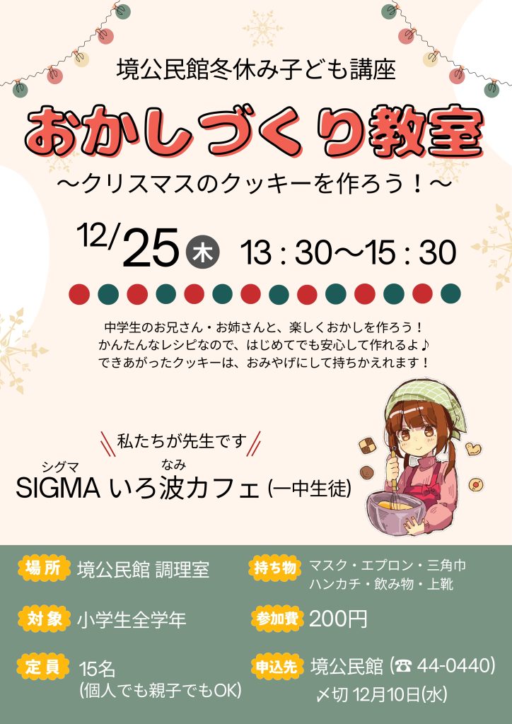 令和7年度の「冬休み子ども講座」のご案内です。今年度は、中学生が講師をつとめる講座を初めて実施します。小学生のお子さん、お孫さんのご参加をお待ちしています。