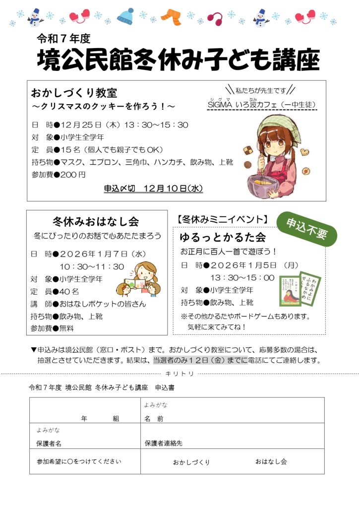 令和7年度の「冬休み子ども講座」のご案内です。今年度は、中学生が講師をつとめる講座を初めて実施します。小学生のお子さん、お孫さんのご参加をお待ちしています。