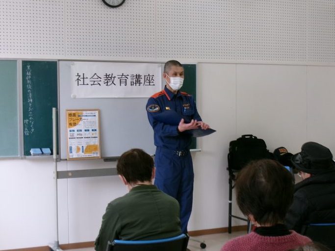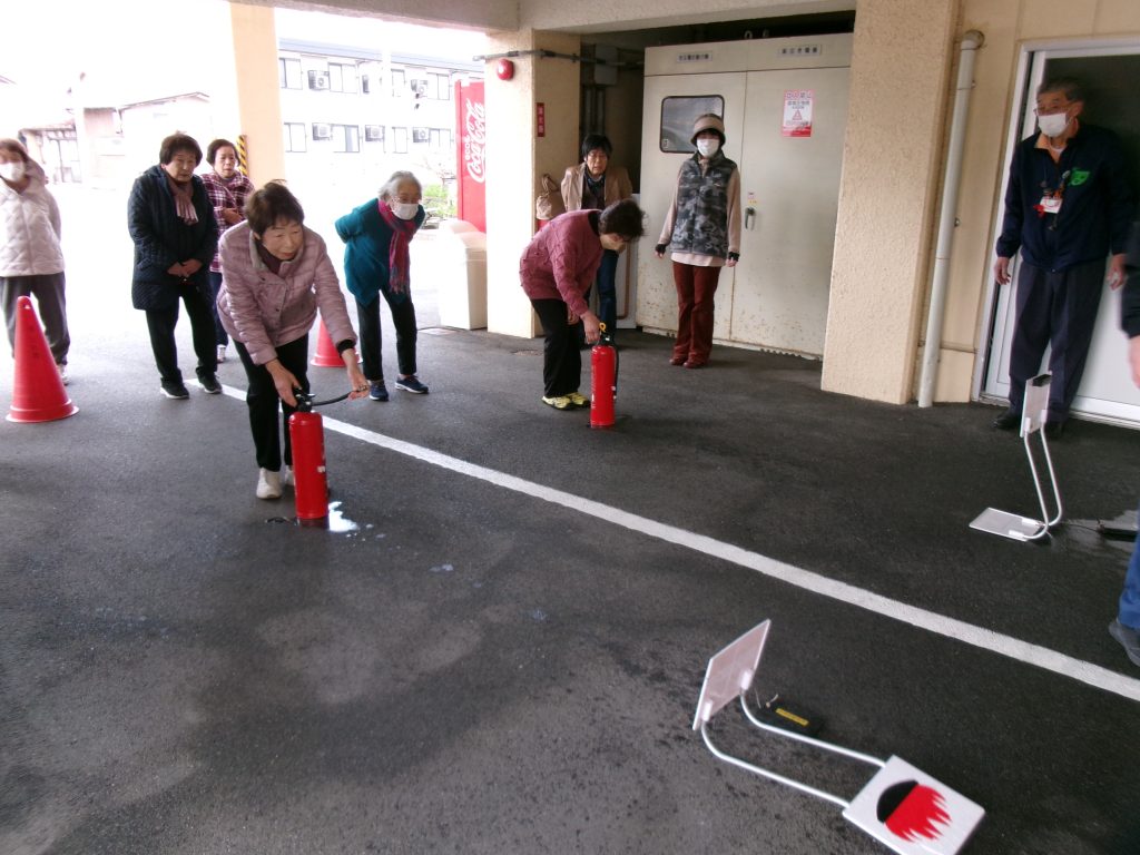 119番通報にちなんだ1月19日(月)、月曜利用サークルの皆さんと「火災・避難訓練」を実施しました。1月6日に発生した地震を受け、今回は地震発生後の出火を想定した避難訓練を行いました。続いて、境港消防署職員の指導のもと、水消火器による初期消火を体験。訓練後の講話では、「地震火災を防ぐポイント」について解説があり、先日の地震の記憶が新しい中、備えの重要性を再認識する講座になりました。